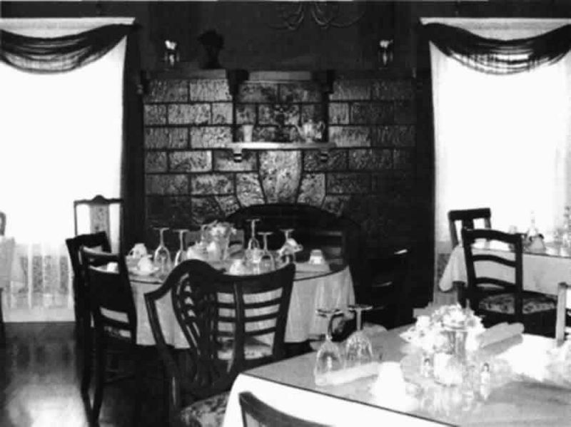 The dining room and fireplace at 225 Spencer, designed by Samuel Plato and now Aunt Sue's Tea Room, as of 2005-07.