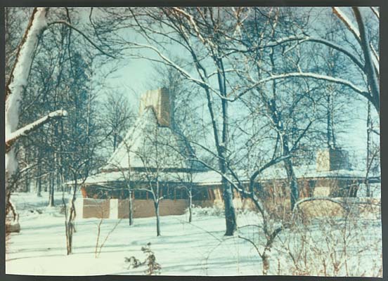 Copy of a color photo of "Woodside", a house designed and built by Frank Lloyd Wright for Dr. Richard Davis family, ca 1953-55. Photo was taken in 1992.