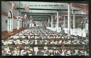 Mess hall at the Soldiers' Home. Waiters, in white, are lined up along side of room, tables are set and prepared for a meal, flags and red & white bunting decorate the room. ca. 1910.